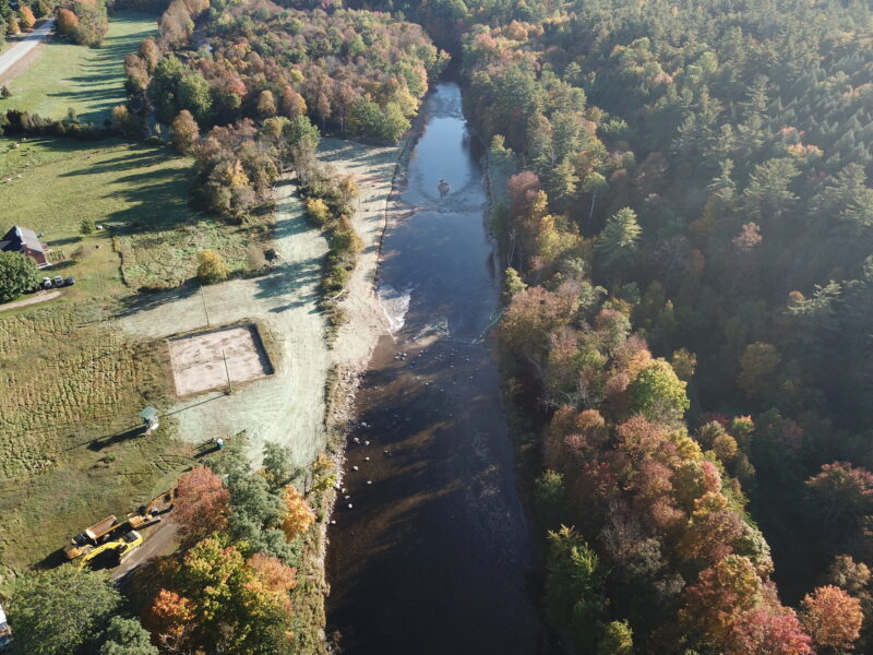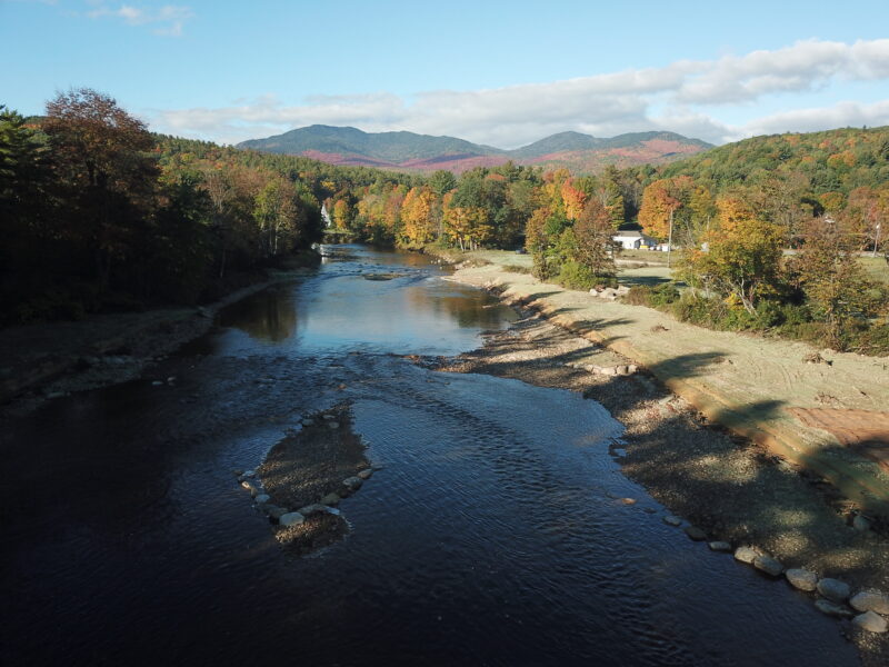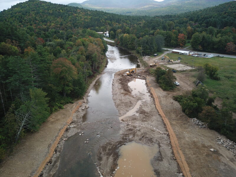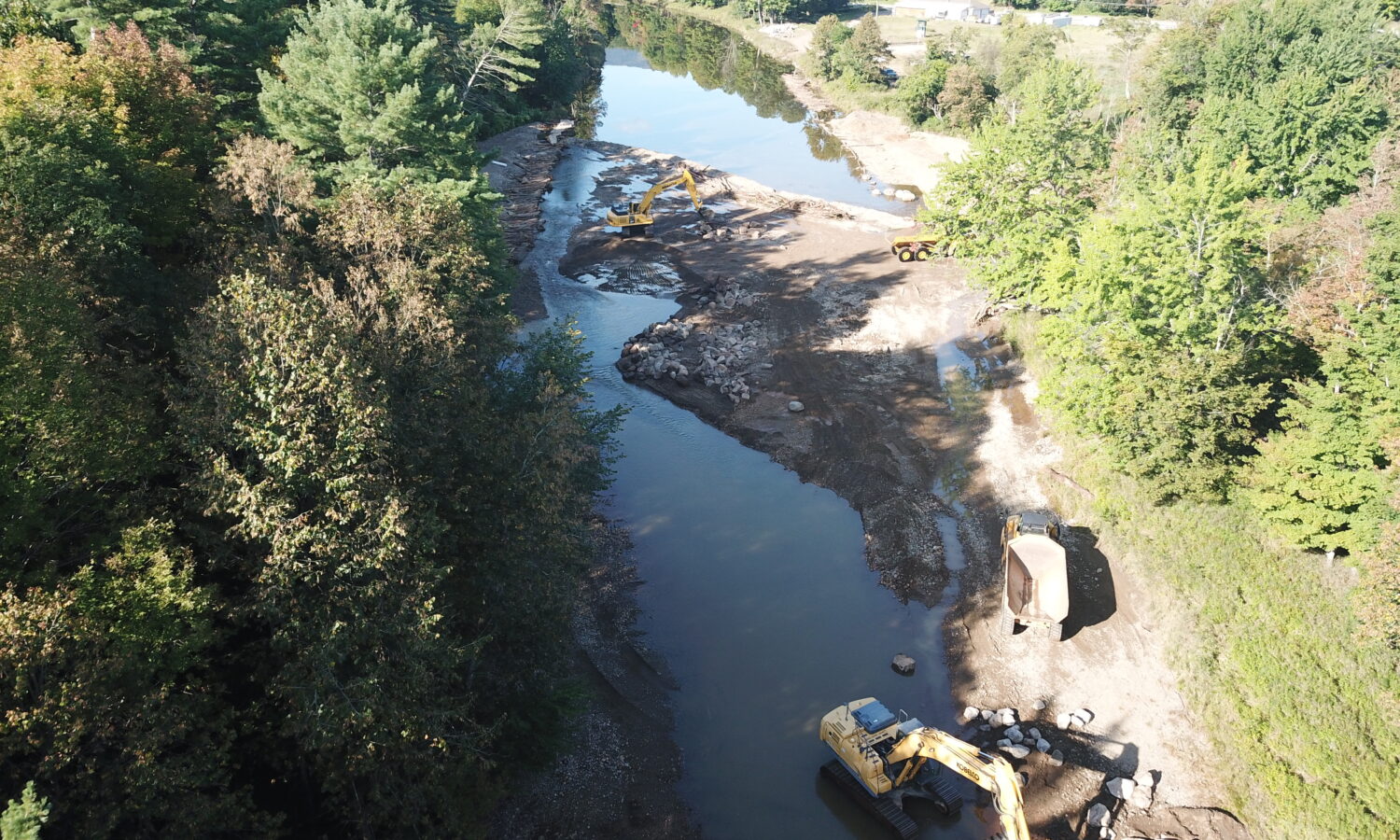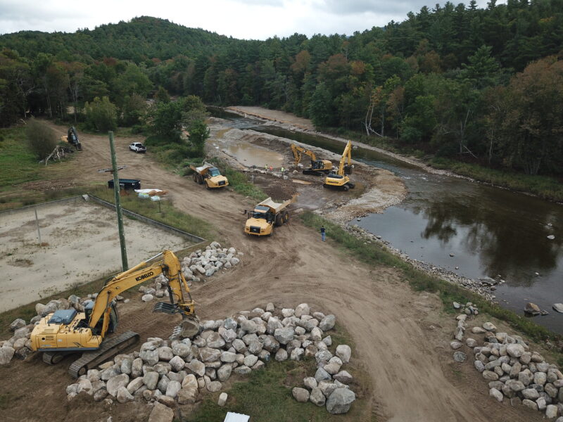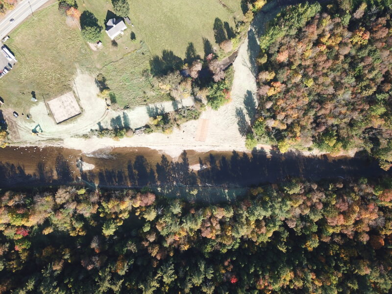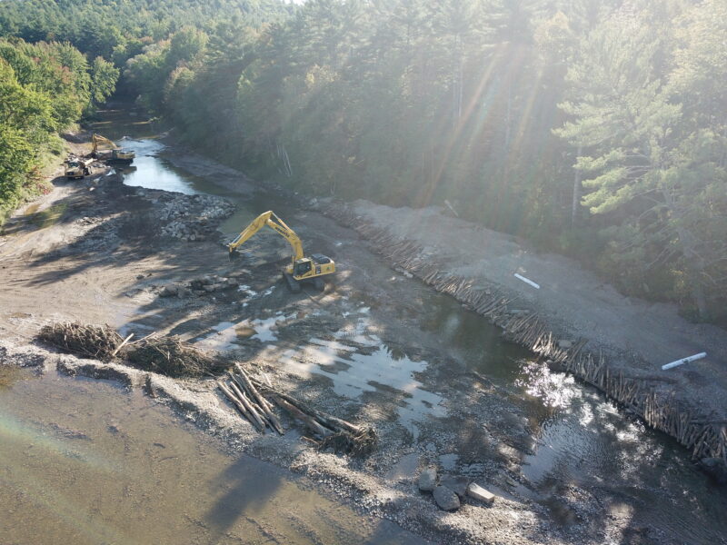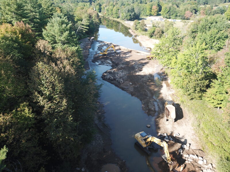 Our team was selected to help restore the East Branch of the Ausable River and prevent future flooding and ice jams from causing damage to neighboring homes and property. After years of embankment erosion caused by flooding and ice jams, the river channel needed to be deepened and the banks widened to allow for excess water during inclement weather. We were tasked with removing the sediment that had built up in the middle of the river, also known as a cobble bar, that caused the embankments to erode. Flash flooding from tropical storms also contributed to significant stormwater erosion conditions. When a river gets wider and shallower, it is difficult to move rocks and other debris downstream, which can cause additional destruction to neighboring towns during a flood.