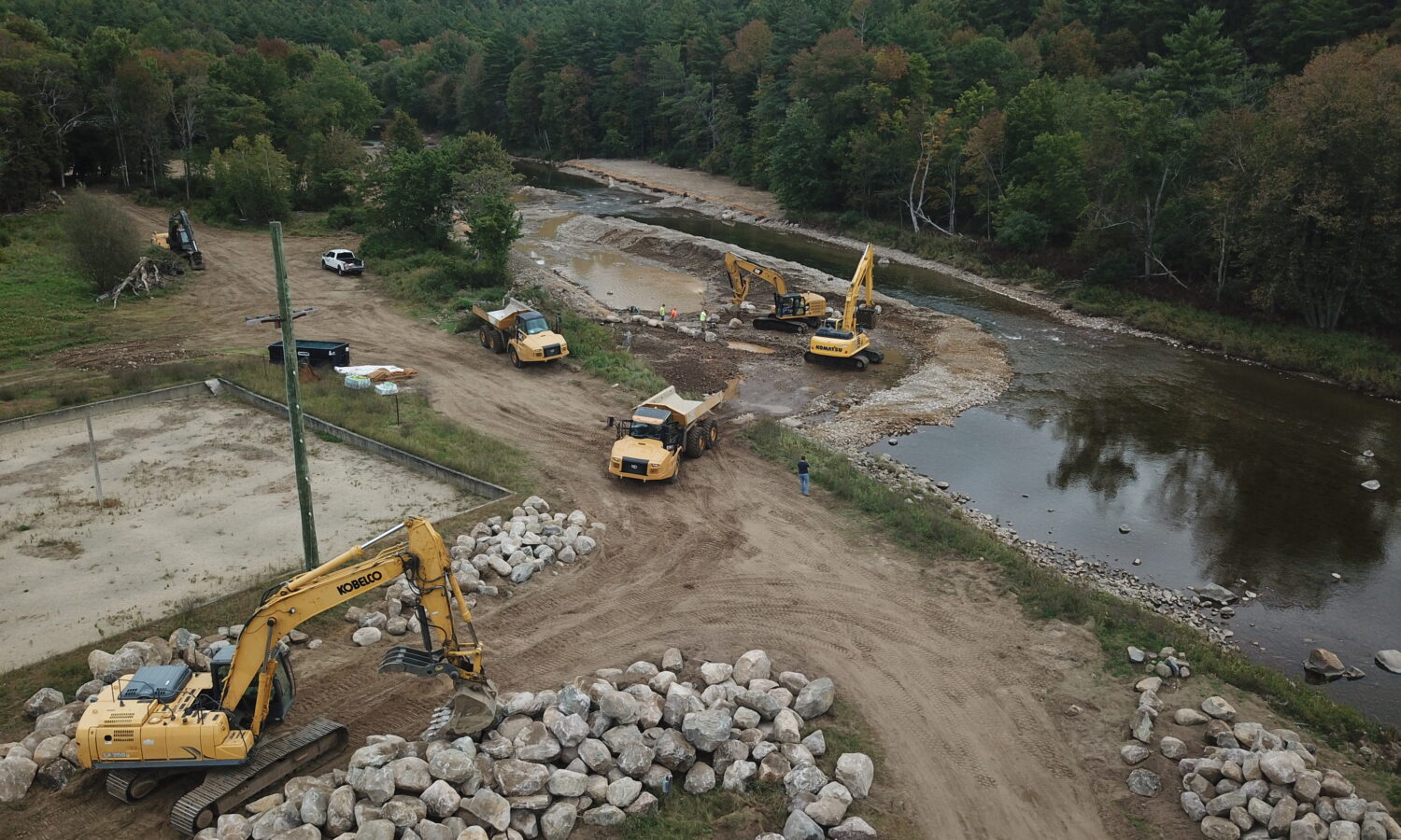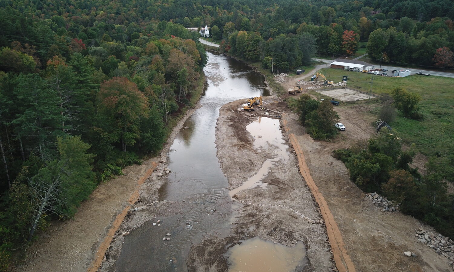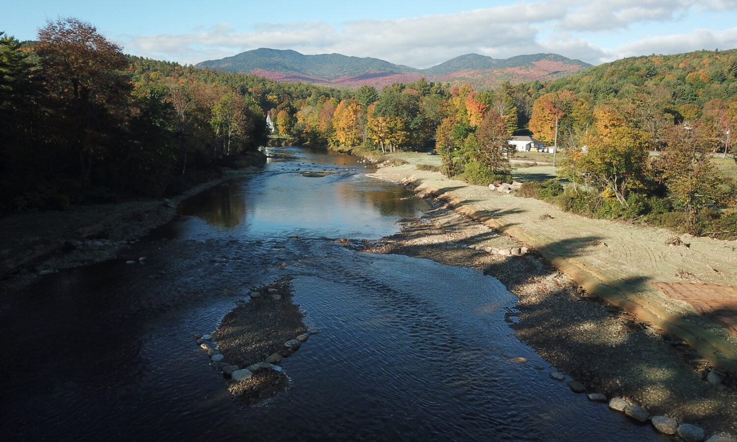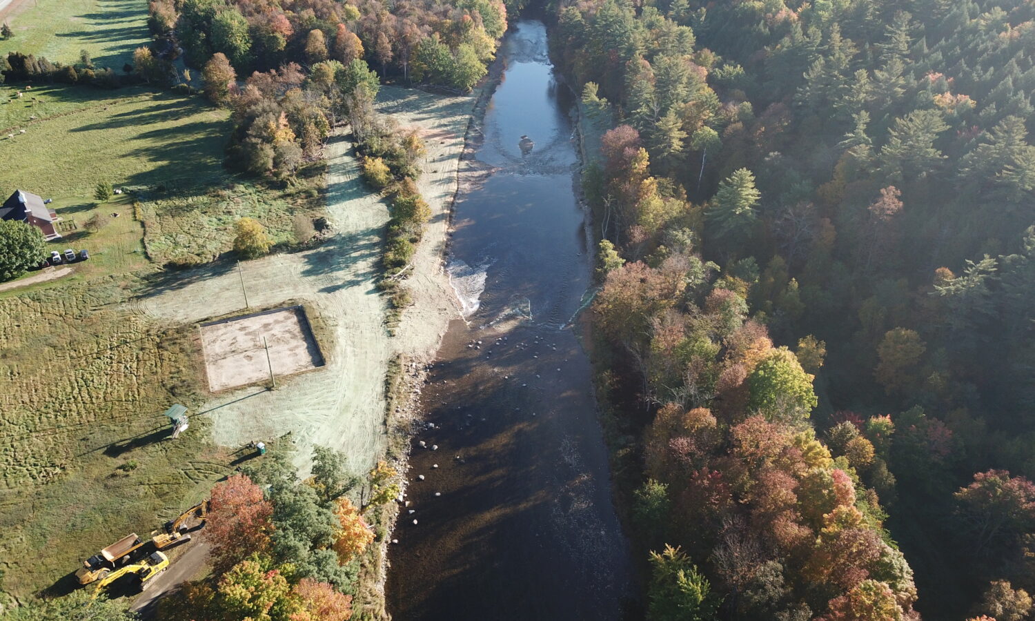 Our team was selected to help restore the East Branch of the Ausable River and prevent future flooding and ice jams from causing damage to neighboring homes and property. After years of embankment erosion caused by flooding and ice jams, the river channel needed to be deepened and the banks widened to allow for excess water during inclement weather. We were tasked with removing the sediment that had built up in the middle of the river, also known as a cobble bar, that caused the embankments to erode. Flash flooding from tropical storms also contributed to significant stormwater erosion conditions. When a river gets wider and shallower, it is difficult to move rocks and other debris downstream, which can cause additional destruction to neighboring towns during a flood.