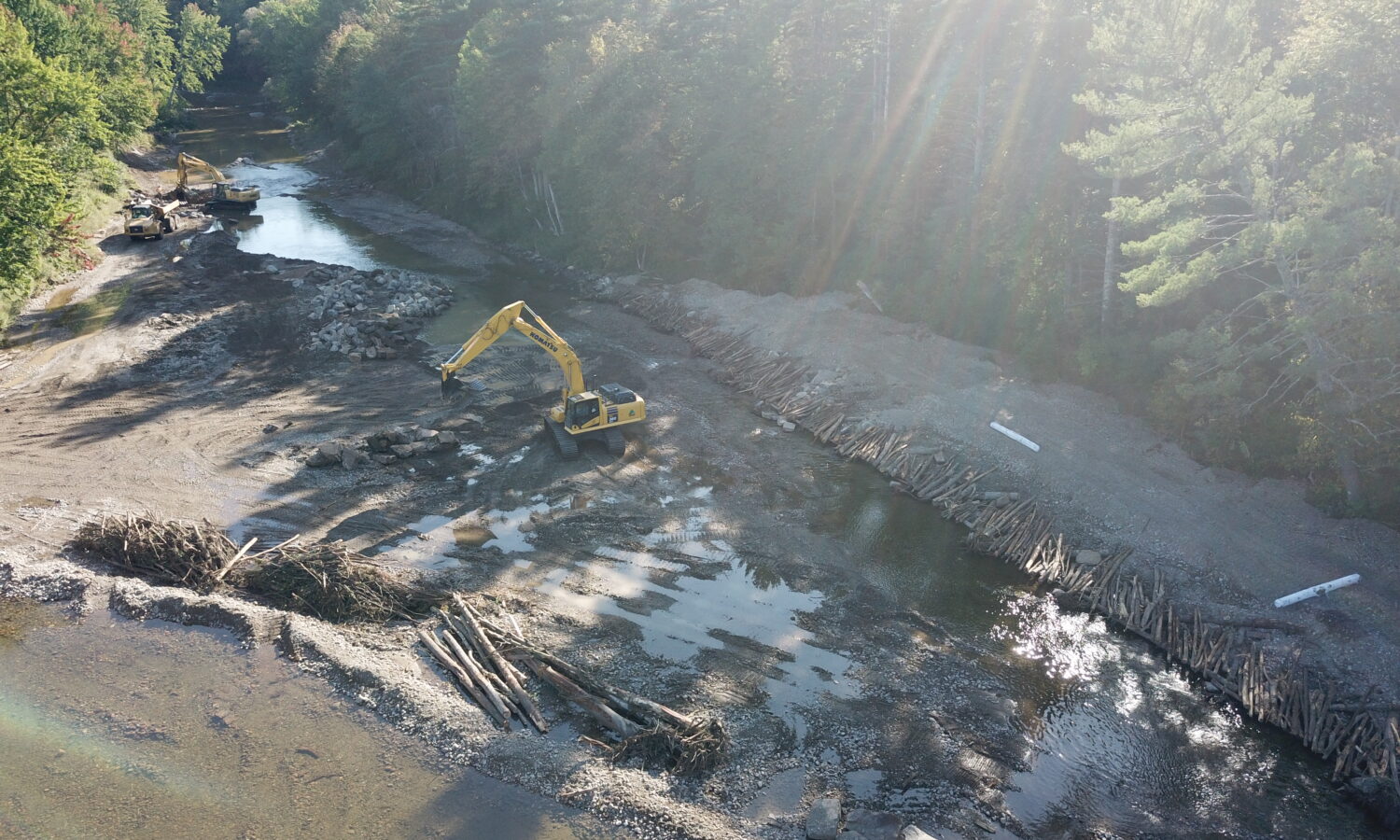 Our team was able to restore the original river grade in the center where a gravel bank had built up. Gravel banks were moved from the center out to the sides and were supported with trees and roots on the sides of the embankment. “W” weirs were built across the width of the stream to avoid damaging riverbanks and to help funnel the current. Toe wood walls were constructed along the banks, acting as a stabilizing retainer. A key milestone for the project was to finish the removal of all sediment, logs, and other debris and complete the installation of “W” weirs, toe jams and boulder piles before the October 1st deadline. Additional manpower was assigned to meet this goal as municipal delays occurred when obtaining permit acquisitions.