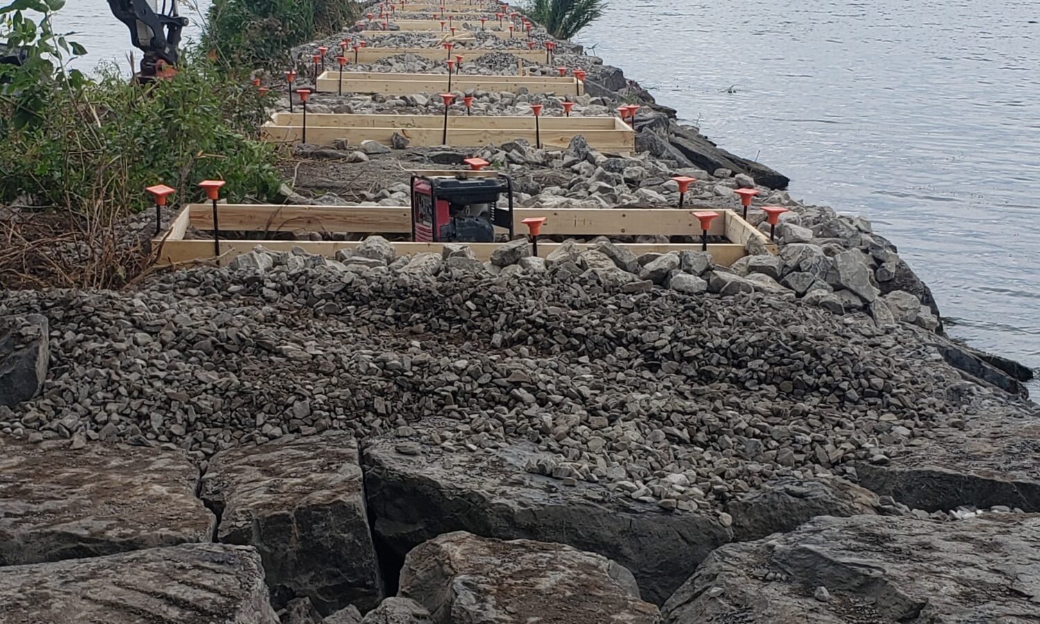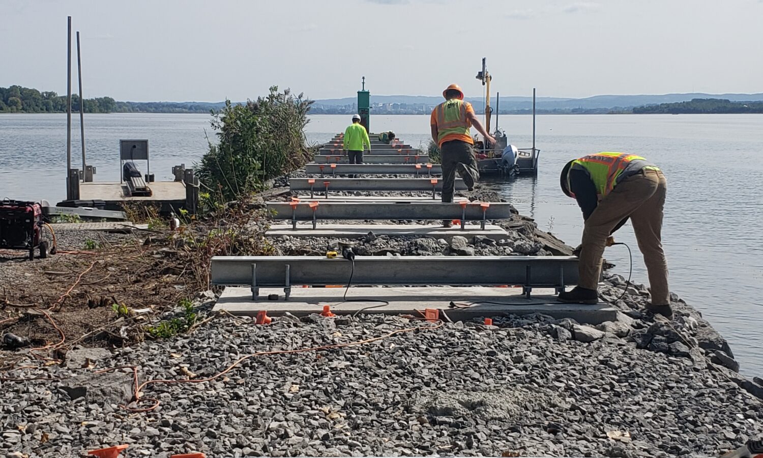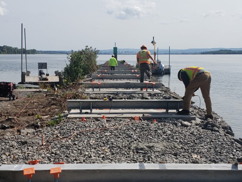 This project required creative problem-solving at every turn. Working along the waterways on both sides of the jetty meant navigating extremely narrow access points while protecting the surrounding environment. Repairing the existing jetty involved carefully integrating stones of various sizes and using concrete to create a solid foundation for the new pier. At the same time, we had to design the pier and coordinate with the right subcontractors and suppliers to manufacture and deliver it. Installing the substructure from a barge added another layer of complexity, all while ensuring safe access through heavily traveled pedestrian areas. Overcoming these challenges required close collaboration, careful planning, and a solution-focused approach from the entire team.